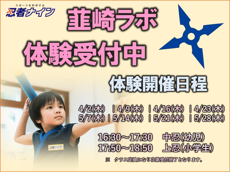 毎週木曜日 16:30~18:50 【中忍】年 中・年 長|16:30~17:30 【上忍】小学1~6年生|17:50~18:50 |