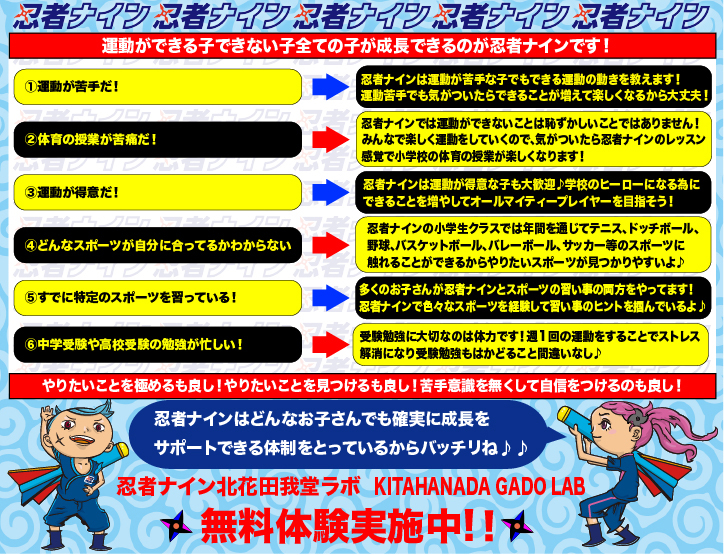 運動能力はもちろん、心身がバランスよく成長する忍者ナインでは、スポーツを通して自分に自信をもち、何事にもチャレンジできる子どもに育ってほしいという思いから、