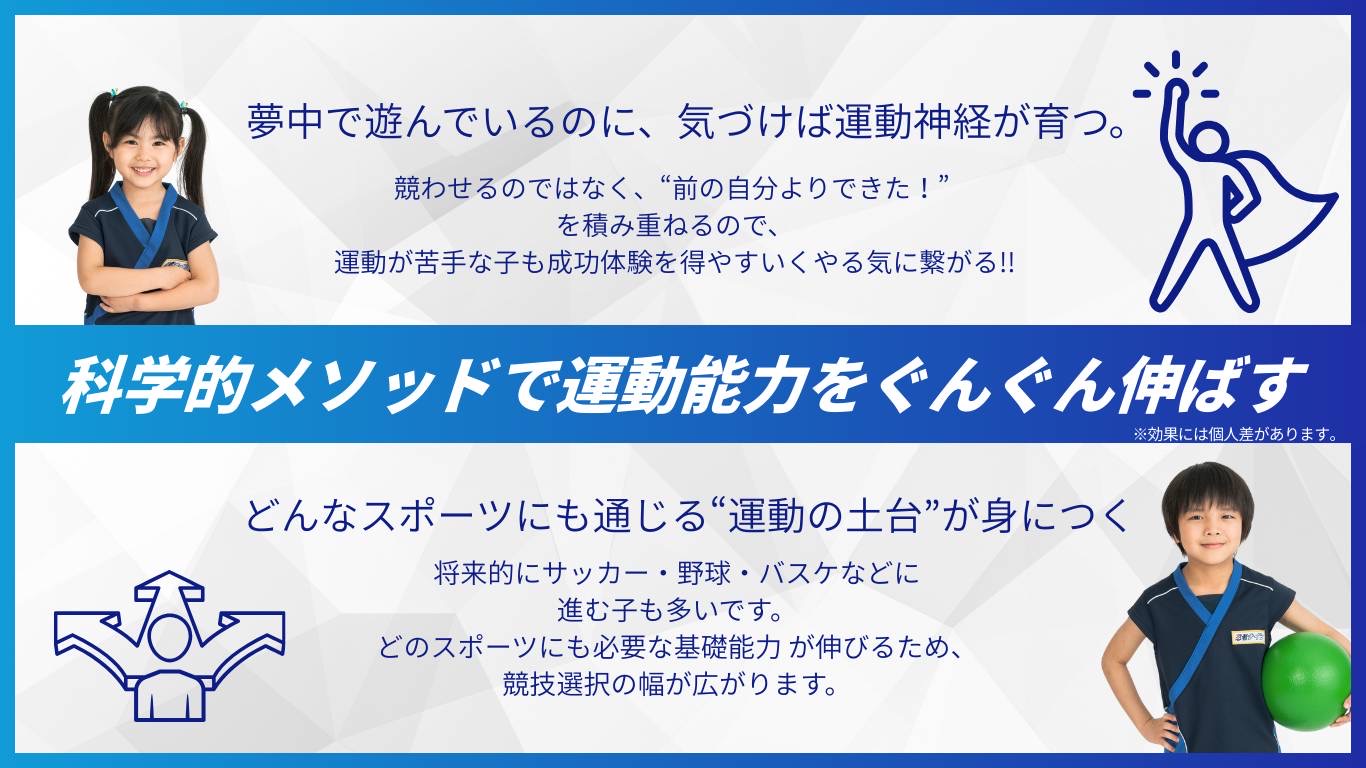 動作の一つ一つを習得して上手になっていくことで、隠されたお子さまのチカラが目覚めていきます。