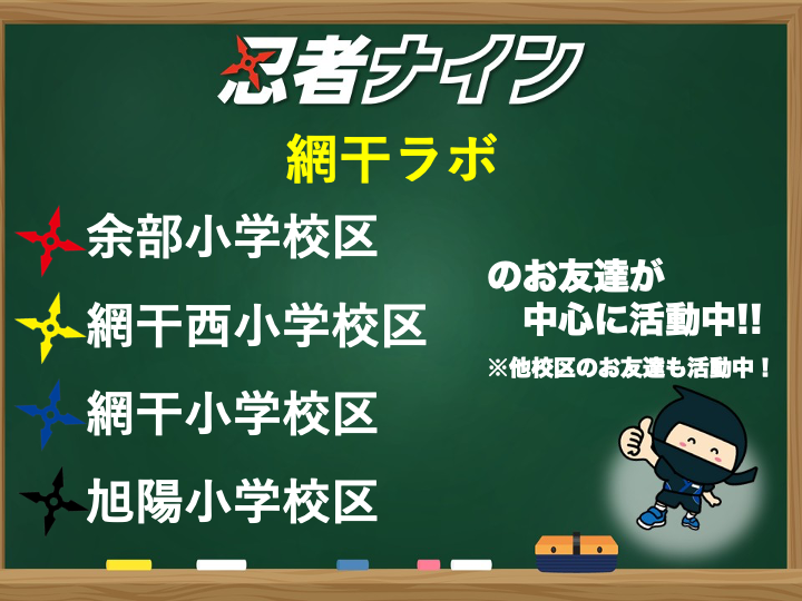 忍者ナイン網干ラボは余部小学校、網干西小学校、網干小学校、旭陽小学校などの生徒が活動中です