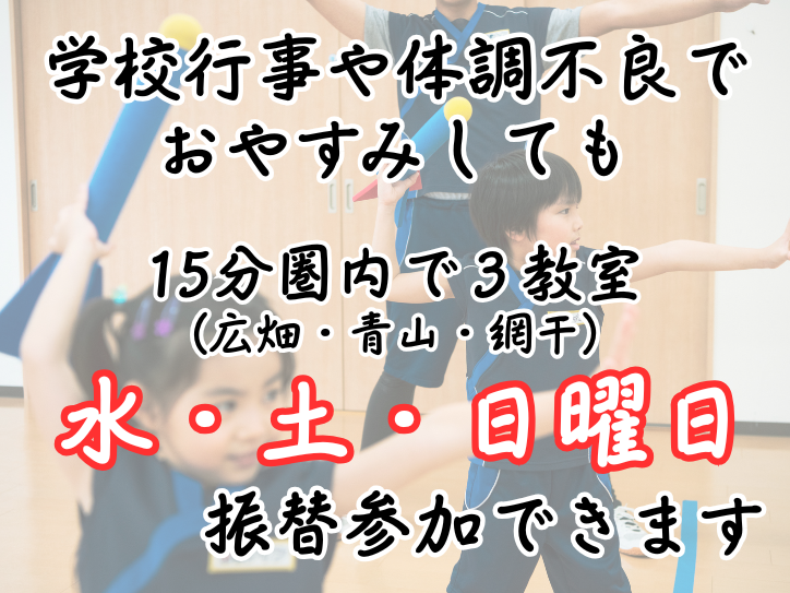 忍者ナイン網干ラボは水曜日、土曜日、日曜日でレッスンの振替ができます!体調不良、学校行事や幼稚園行事でお休みしてしまっても安心して通うことができます。