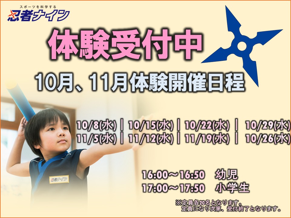 毎週水曜日 16:00~17:00 【入門】年 少・年 中|16:00~16:50 【中忍】年 中・年 長|16:00~16:50 【上忍】小学1~6年生|17:00~17:50 |