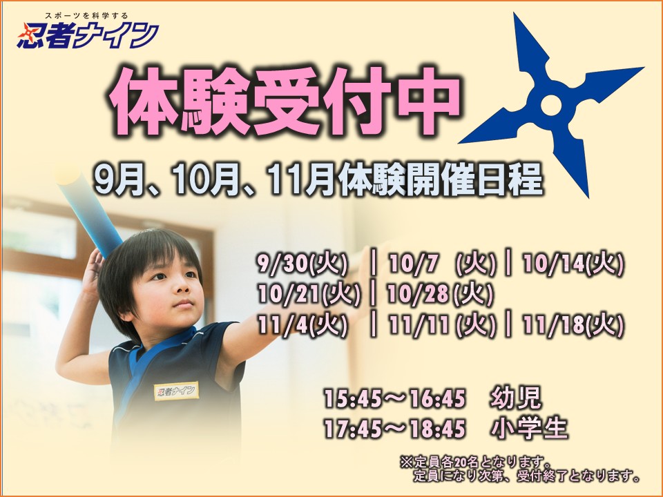 毎週火曜日 15:30~18:45 【入門】年 少・年 中|15:30~16:10 【中忍】年 中・年 長|16:15~17:45 【上忍】小学1~6年生|17:15~18:45 |