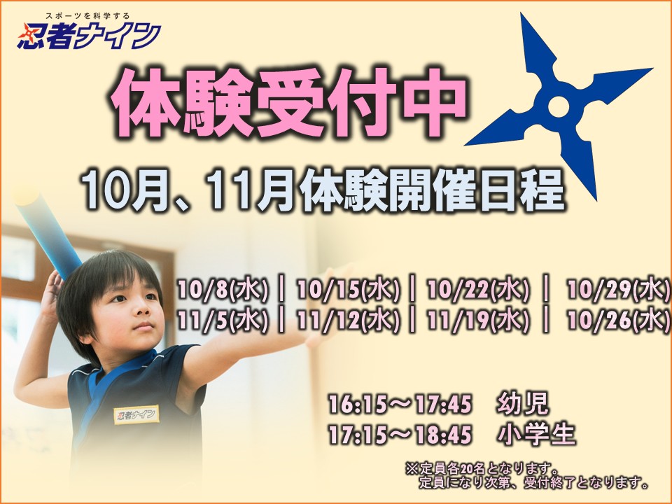 毎週水曜日 16:15~18:45 【中忍】年 中・年 長|16:15~17:45 【上忍】小学1~6年生|17:15~18:45 |