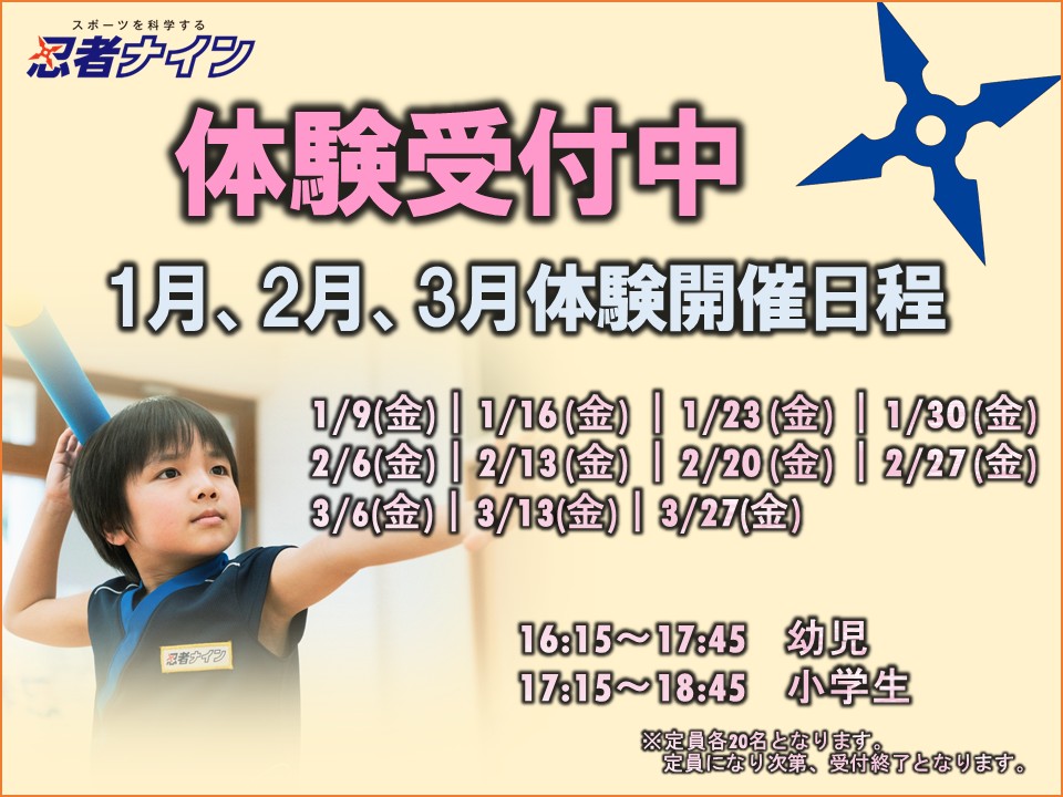 毎週金曜日 16:15~18:45 【入門】年 少・年 中|16:15~17:05 【中忍】年 中・年 長|16:15~17:45 【上忍】小学1~6年生|17:15~18:45 |