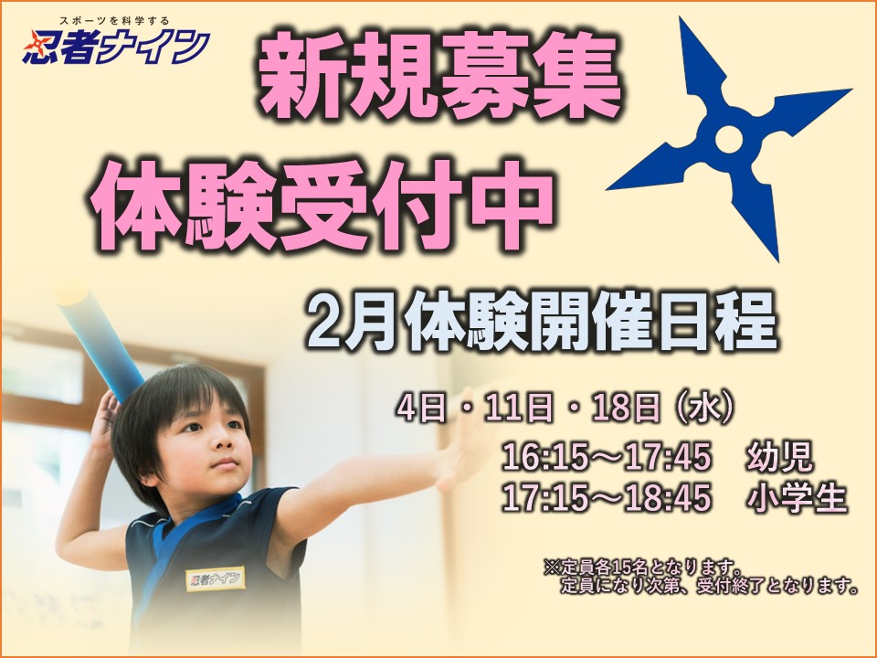 水曜日 16:15~18:45 【中忍】年 中・年 長|16:15~17:45 【上忍】小学1~6年生|17:15~18:45 |