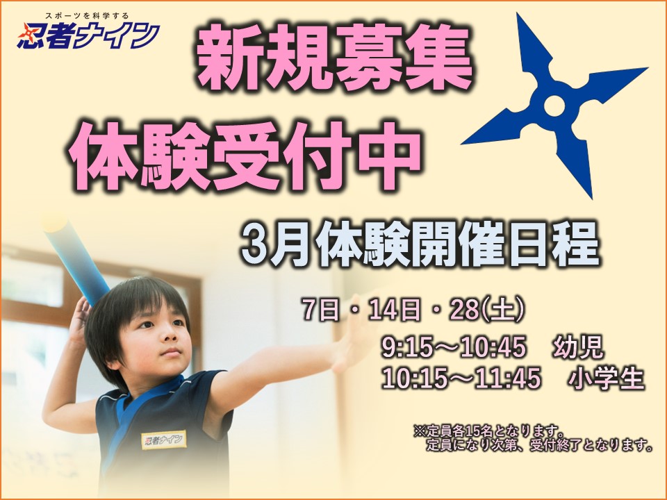 土曜日 9:15~11:45 【中忍】年 中・年 長|9:15~10:45 【上忍】小学1~6年生|10:15~11:45 |