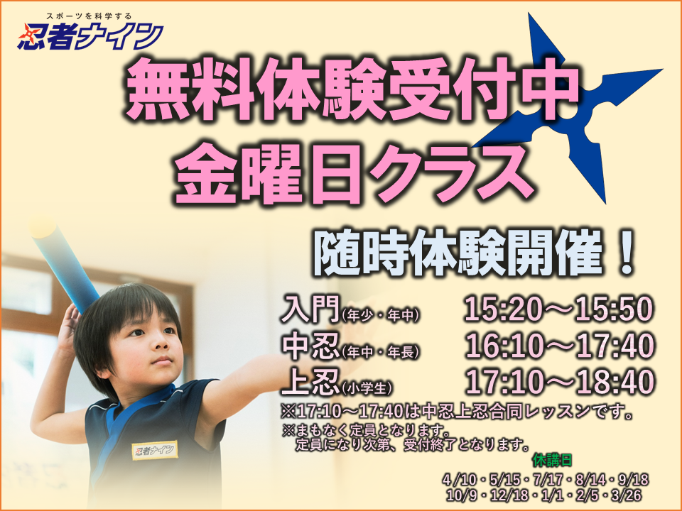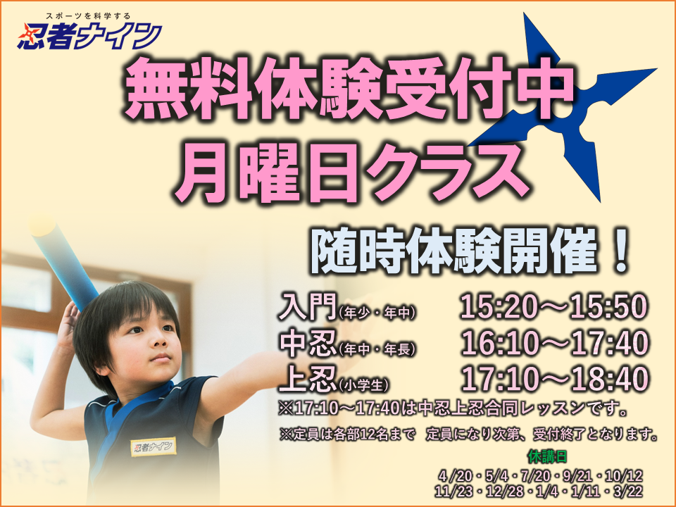 月・金 【入門】年少・年中|15:20~16:00/【中忍】年中・年長|16:10~17:40/【上忍】小学生|17:10~18:40 日曜日 【中忍】年中・年長|14:30~16:00/【上忍】小学生|15:30~17:00 |