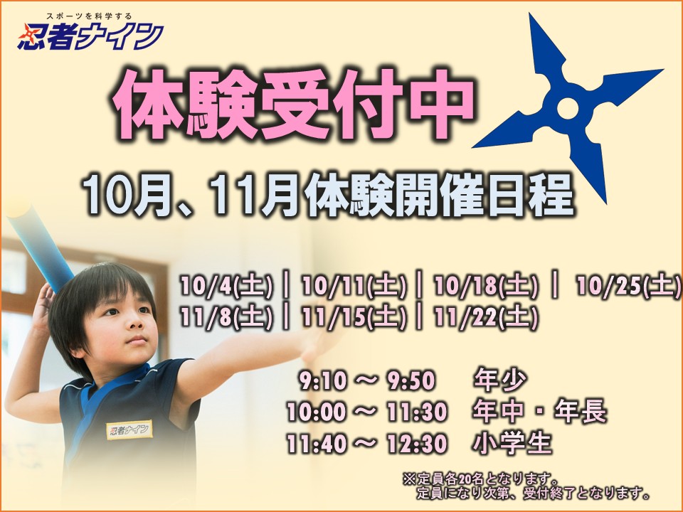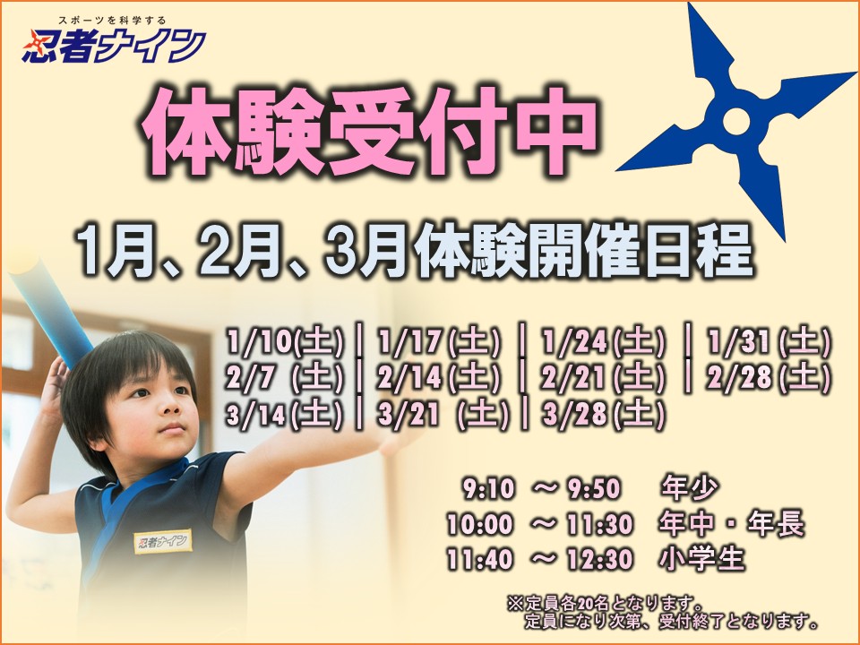 毎週土曜日 9:10~12:30 【入門】年 少・年 中|9:10~9:50 【中忍】年 中・年 長|10:00~11:30 【上忍】小学1~6年生|11:00~12:30 |