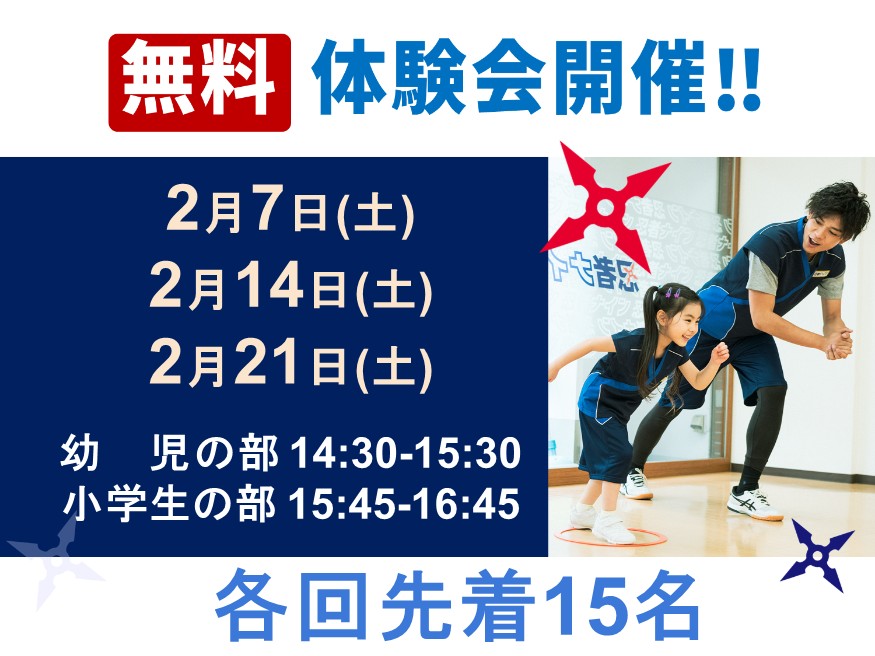 毎週土曜日 14:30~16:45 【中忍】年 中・年 長|14:30~15:55 【上忍】小学1~6年生|15:25~16:50 |