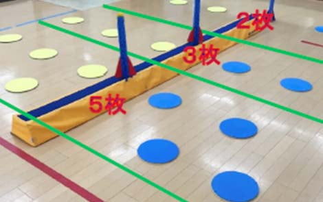リレー方式で順番に、丸い板を全てひっくり返したチームの勝利。幼児のお子さまは1回で2枚ひっくり返せるなどのルールがあるので、そのルールやメンバーの個性を加味した戦略が必要です。
